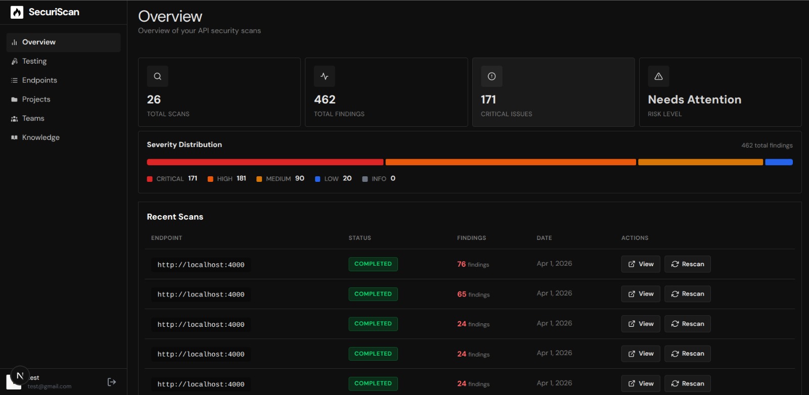 Scan endpoints, uncover flaws, and generate structured reports all inside one focused platform built for API security teams.
